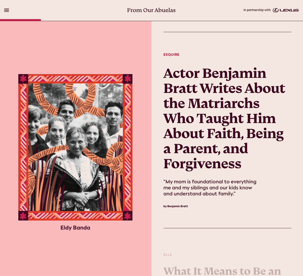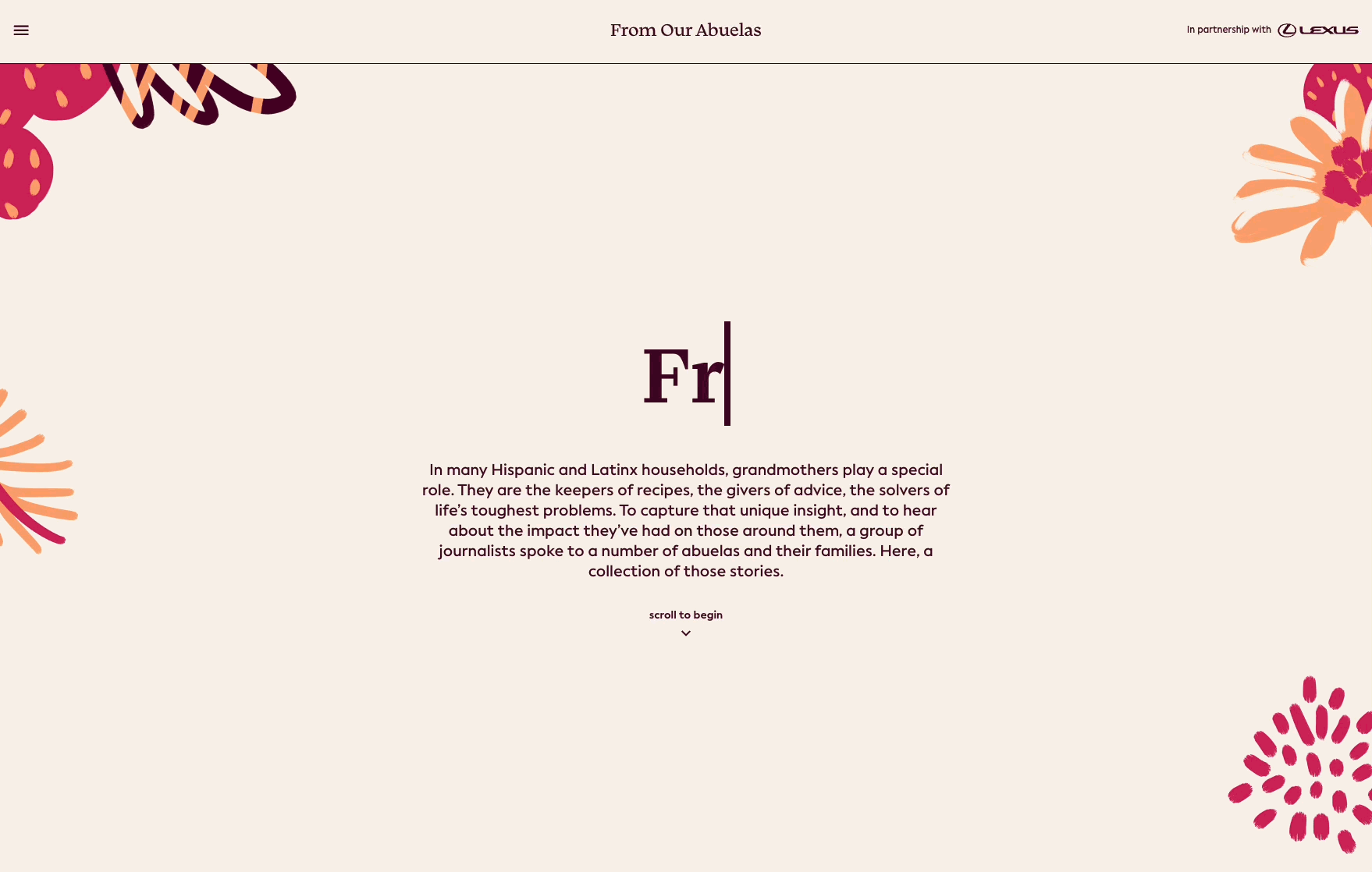 From Our Abuelas, created in partnership with Lexus, is a series running across Hearst Magazines to honor and preserve generations of wisdom within Hispanic and Latinx communities. This interactive package on Oprah Daily is a visual storytelling experience that celebrates the heritage, wisdom, and culinary traditions passed down from grandmothers, or "abuelas," in Latinx families.